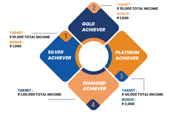Earn monthly bonuses by hitting specific income targets through direct sales and downline profits, with carefully designed levels to recognize and reward top performers.